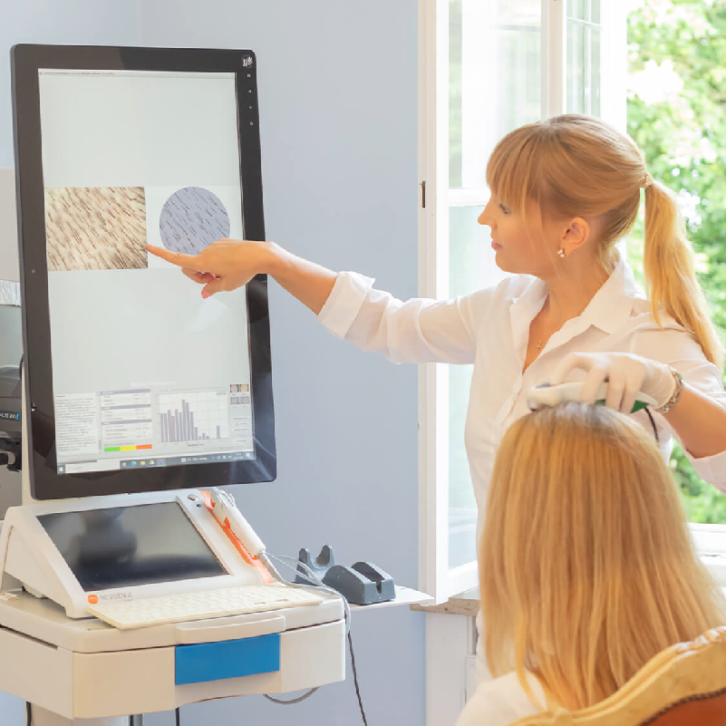 Eine gezielte Therapie beginnt mit einer sorgfältigen Analyse. In unserer dermatologischen Praxis kombinieren wir moderne apparative Verfahren mit einer ausführlichen medizinischen Anamnese, um die Ursache Ihres Haarausfalls präzise einzugrenzen.